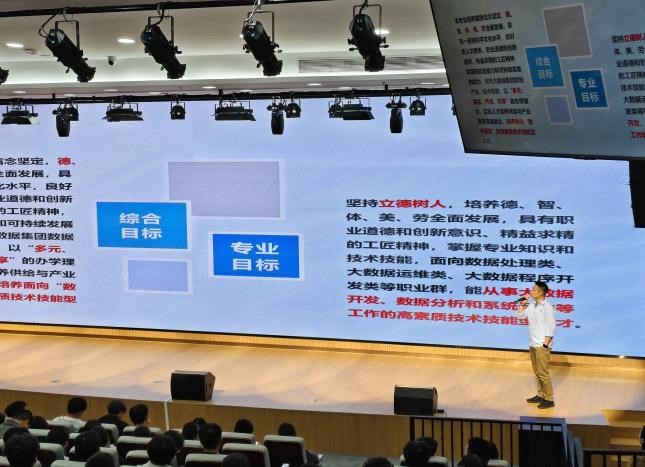 随后,魏晓微老师详细介绍了大数据技术专业的培养目标和课程体系,该专业致力于培养具有坚定理想信念、全面发展的高素质技术技能型人才,特别是在大数据领域的技术开发、数据分析及系统运维等方面,具备扎实的专业能力和良好的职业道德。