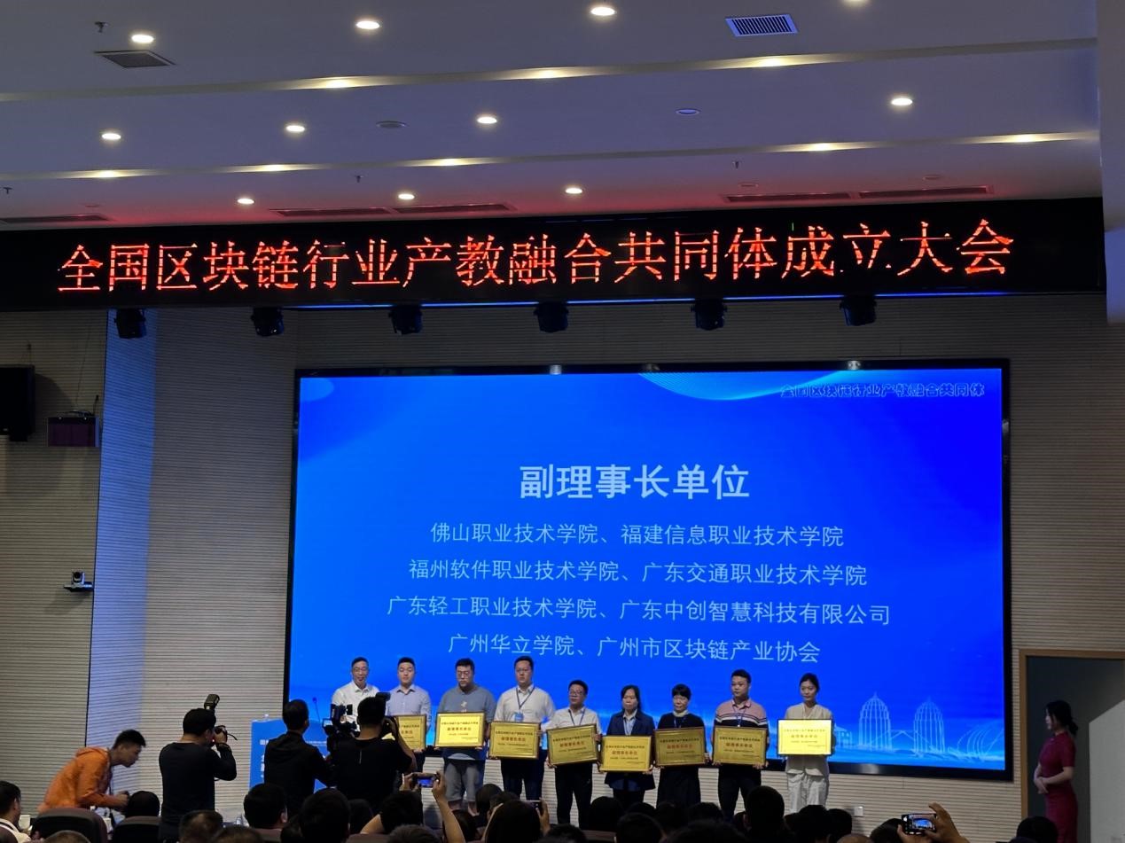 10月8日—9日,由杭州趣链科技有限公司、中山大学、广州番禺职业技术学院共同牵头的全国区块链行业产教融合共同体成立大会在广州番禺职业技术学院召开。来自全国各地的职业院校、本科院校校领导、二级学院院长和专业教师,多家科研机构、行业协会、企业代表近200人参加会议。会上,福州软件职业技术学院当选全国区块链行业产教融合共同体副理事长单位。