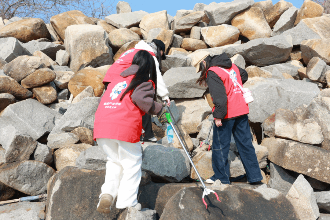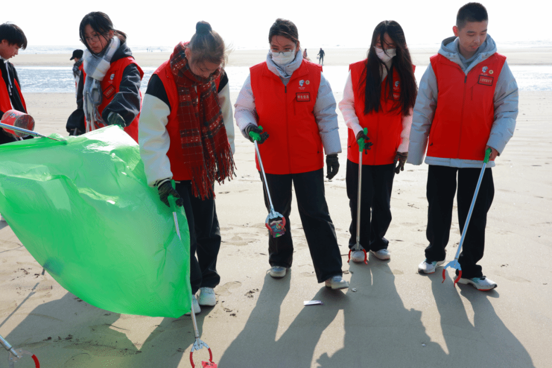 净滩护海活动正式开启,入党积极分子们分组奔赴沙滩、礁石区域:手持垃圾夹俯身穿梭于滩涂间,细致捡拾烟头、塑料瓶、食品包装等杂物,连石缝、潮间带的隐蔽垃圾也逐一清理。小组内分工配合,有人专注收集,有人协助分类装袋,默契协作让现场忙碌却井然有序,用青春温度传递志愿温情。暖阳下的海滨,红色马甲与蓝色海岸线相映,成为冬日里鲜活的 “环保风景线”。