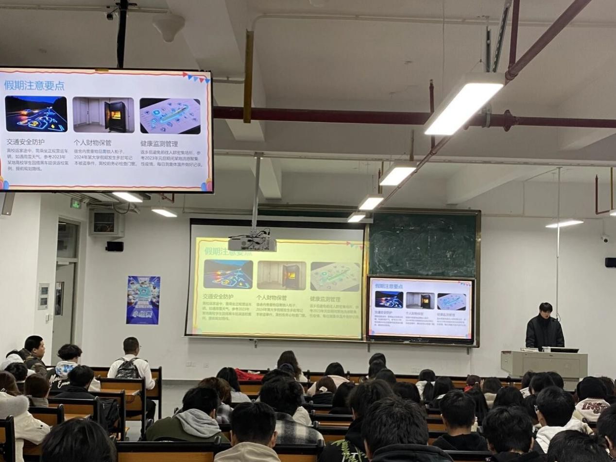 时序更替,华章日新,马年元旦佳节将至。为切实筑牢假期安全防线,让同学们度过一个平安、愉快的假期,2025年12月29日,数据产业学院组织开展“元旦假期安全”主题教育班会,各专业辅导员向同学们提供一系列的假期安全知识、注意事项和建议,帮助同学们防范安全隐患,确保自身安全。
