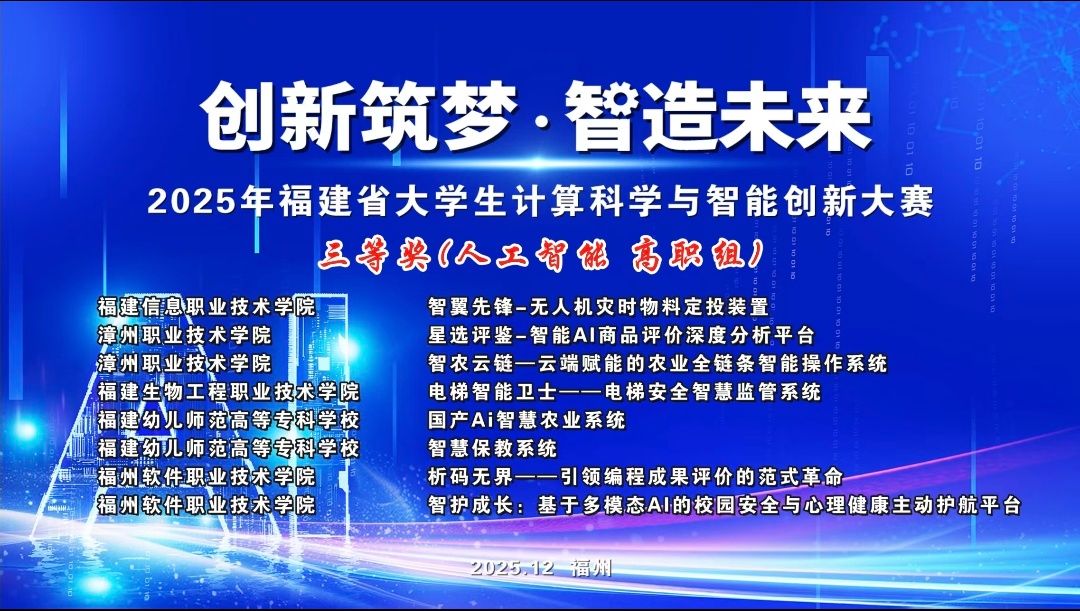 数据产业学院的参赛项目“智护成长:基于多模态AI的校园安全与心理健康主动护航平台”,在人工智能高职组的激烈角逐中脱颖而出,荣获三等奖。 本次大赛以“创新筑梦·智造未来”为主题,吸引了全省众多高校的优秀团队参赛。
