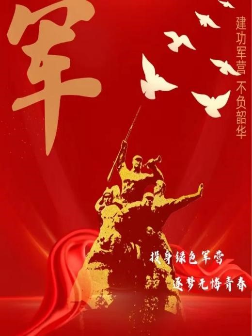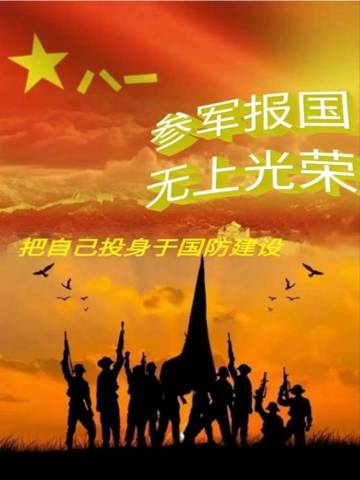 参军,意味着踏上新的征程,承载着神圣的责任。有为青年立志从军,热血男儿精忠报国,把青春之花绽放在祖国最需要的地方,把荣光写在中华天地间。踏入迷彩军营,为梦想寻找归处。男子汉,手中枪,昂头挺胸向前冲,冲出人生路;保国家,爱人民,端端正正立自身;苦锻炼,甜开怀,欢欢喜喜迎参军。飞鸟有自己的天空,落叶有自己的归宿,军人同样有自己的使命。祝福即将踏入军营的你,好好努力,万事顺利!