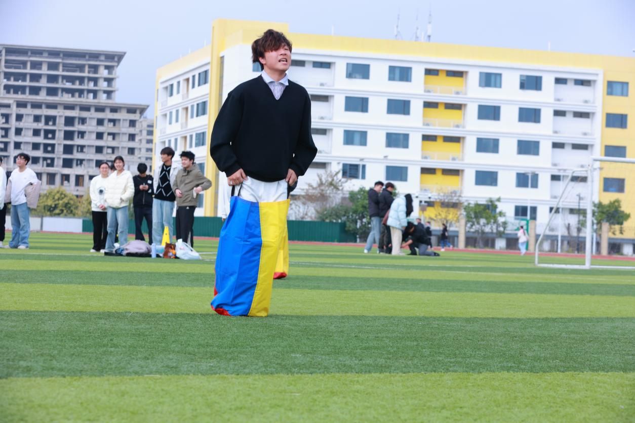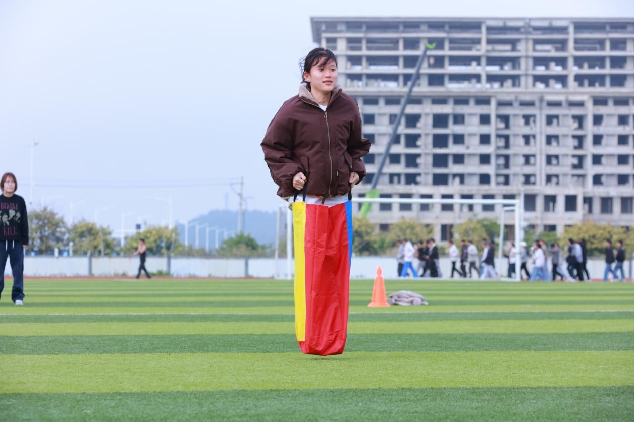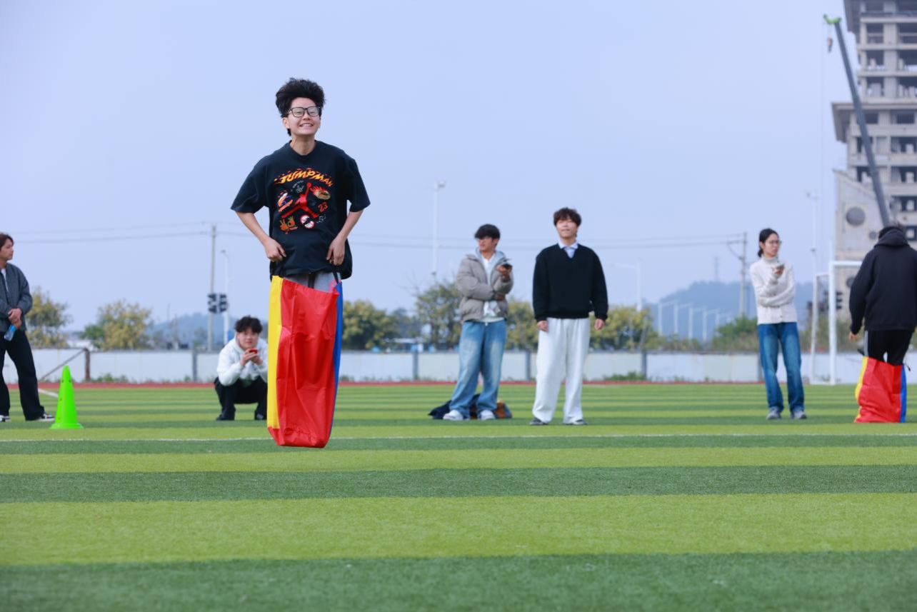 哨声一响,选手们化身灵动袋鼠,双脚套袋、提袋起跳,一蹦一跳向前冲刺。赛道上,有人步伐稳健、节奏轻快,有人奋力追赶、笑料不断。摔倒了立刻起身,落后了咬牙坚持,每一次腾空都充满力量,每一次落地都向着胜利靠近。袋鼠跳不仅考验平衡与敏捷,更展现了同学们不服输的青春劲头。
