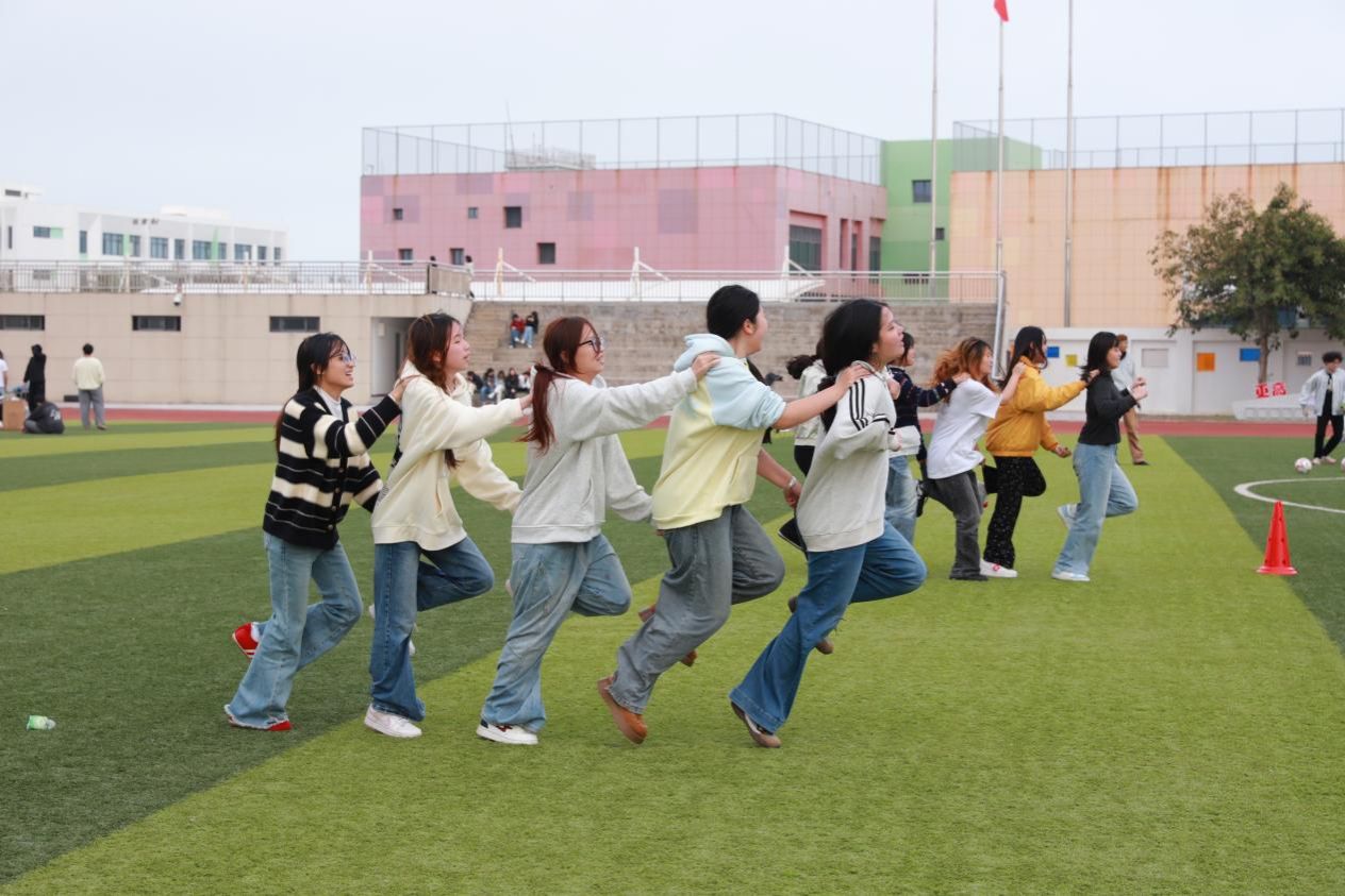 五人并肩,相邻脚踝紧紧相系,一条绑带联结起五颗同心。“一二一、一二一”,口号整齐嘹亮,脚步默契同频。从起步到冲刺,大家互相提醒、彼此扶持,把速度与协调融为一体。稍有不慎就会打乱节奏,但队员们快速调整、重整队形,用信任与配合跑出团队最佳速度,诠释“同心则强、同行致远”。