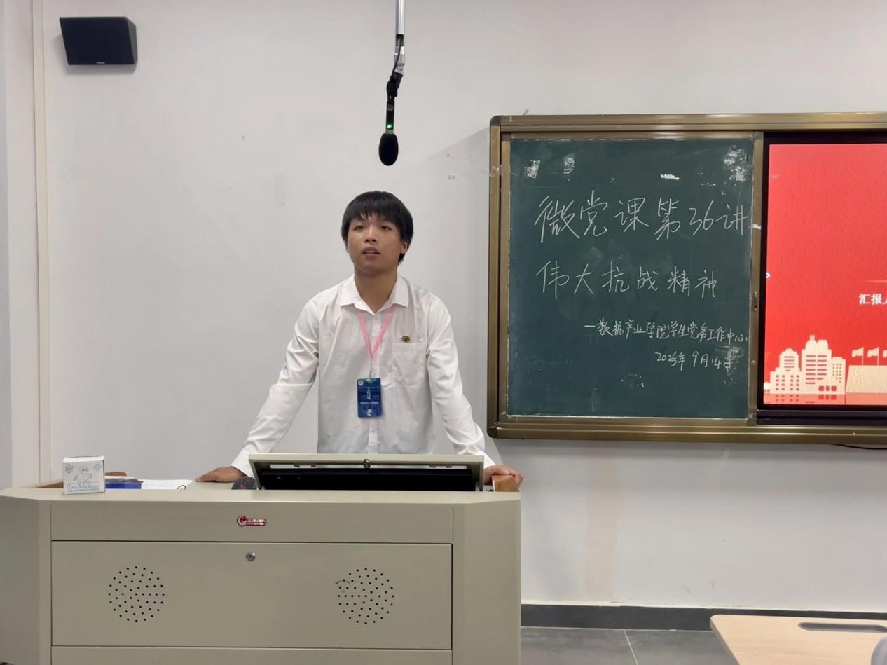 在微党课中,朱锐涛同学以“伟大抗战精神”为主题,系统回顾了中华民族十四年抗战的光辉历程与巨大牺牲,深刻阐释了以爱国主义为核心的抗战精神内涵,包括天下兴亡、匹夫有责的爱国气节,视死如归、宁死不屈的民族气节,以及百折不挠、血战到底的必胜信念。通过展现2025年九三阅兵的庄严场景与国产装备的强大实力,进一步彰显了新时代中国捍卫和平、不忘历史的坚定决心。