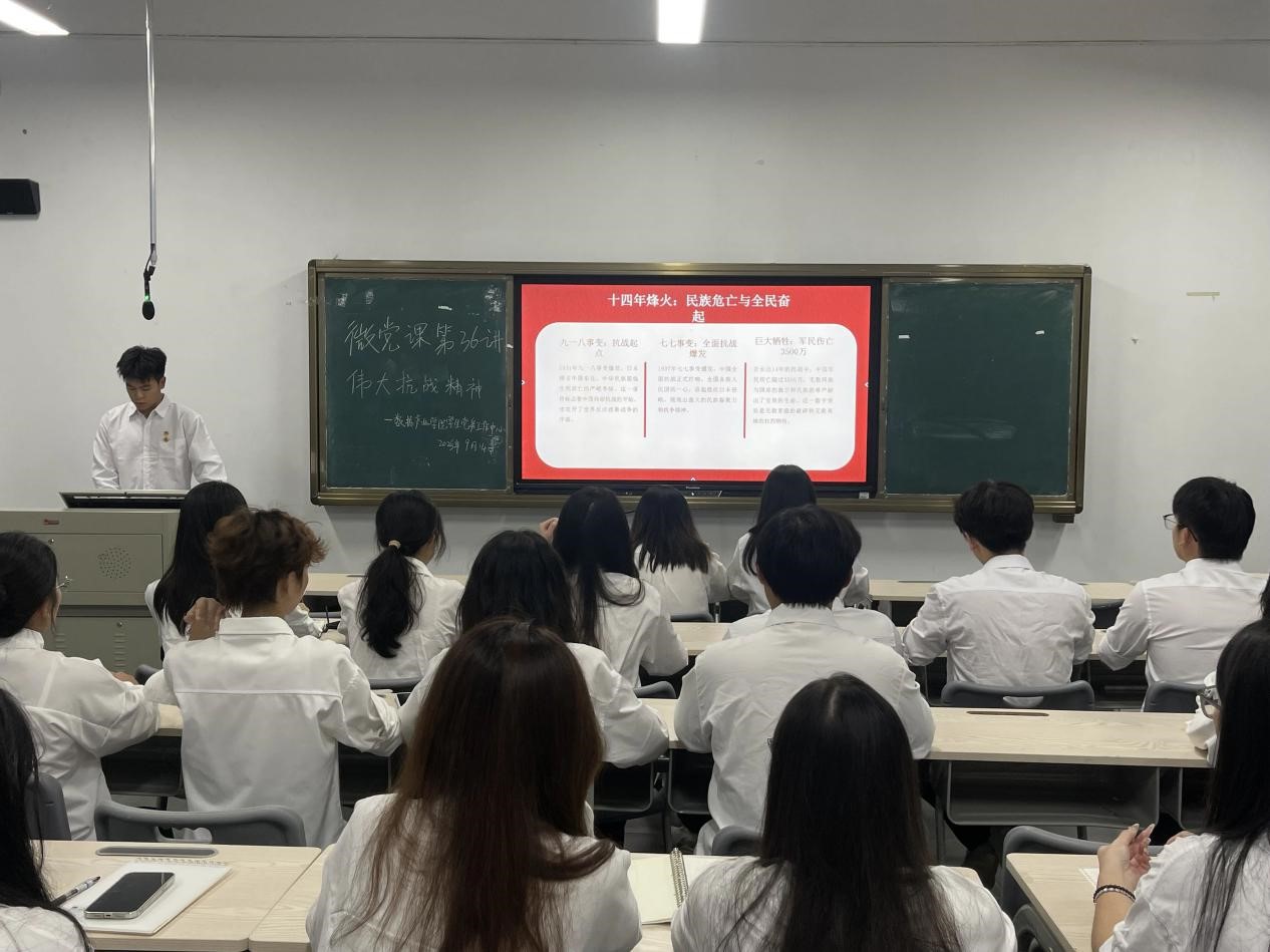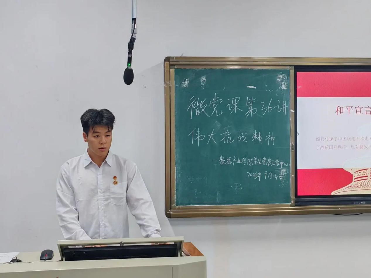 为持续传承伟大抗战精神,以精神伟力护航事业高质量发展,切实将精神力量转化为干部自觉行动,数据产业学院学生党务工作中心组织开展《弘扬抗战,矢志报国》主题微党课,由赖宏涛同学主持,朱锐涛同学讲授本次微党课,学院全体入党积极分子共同参与。