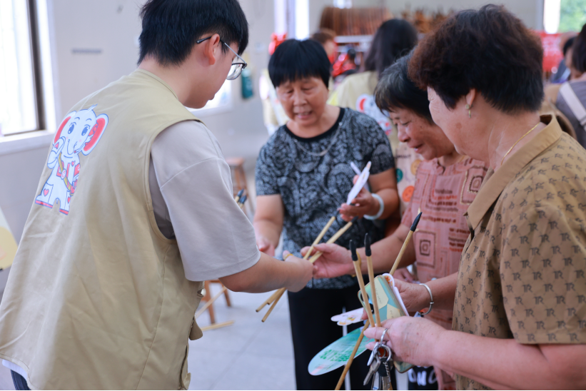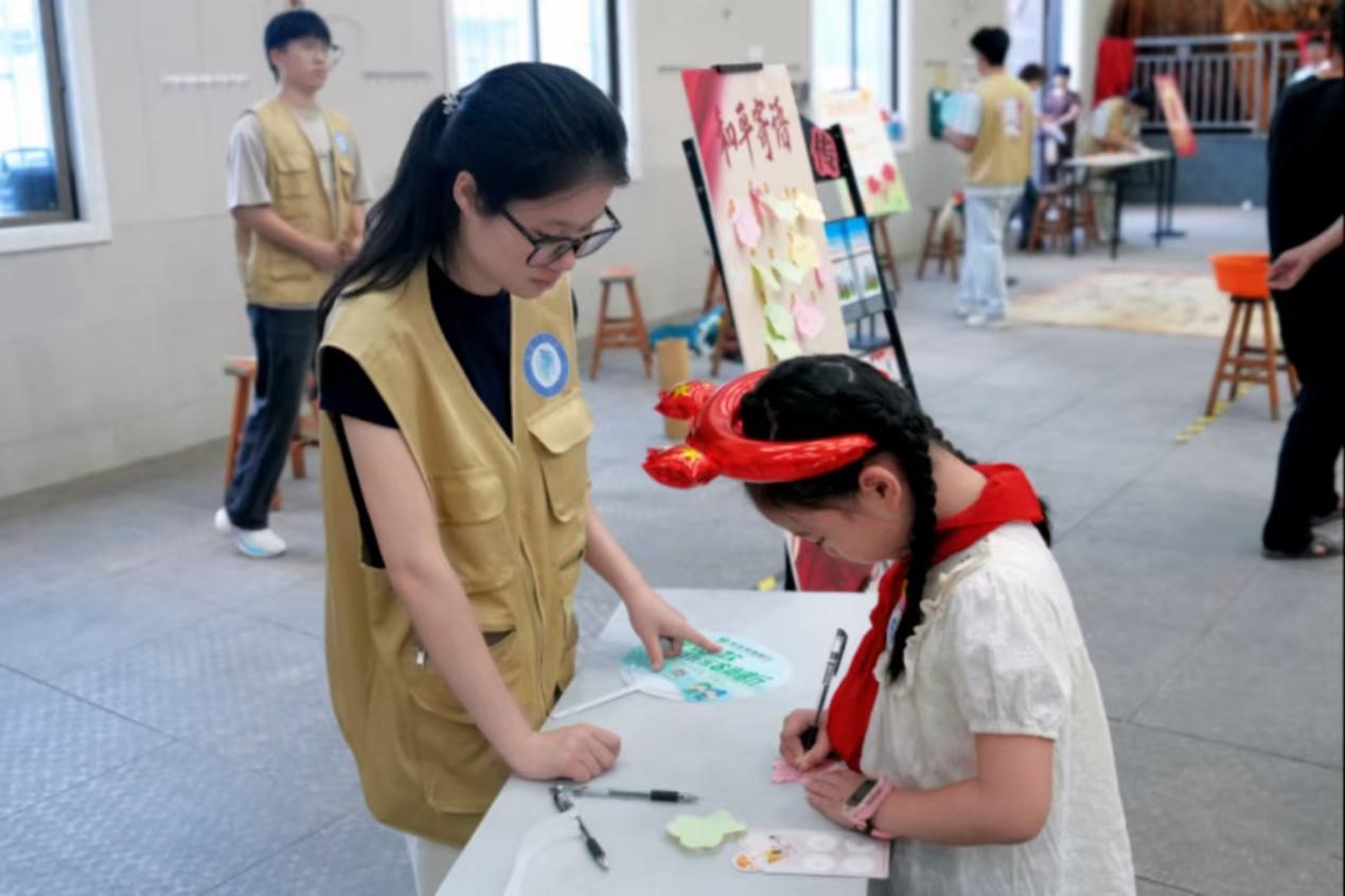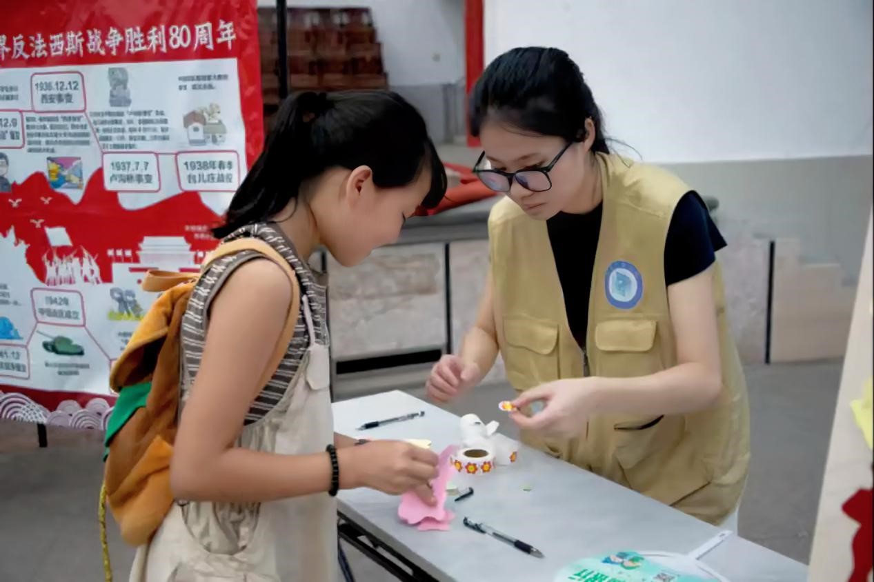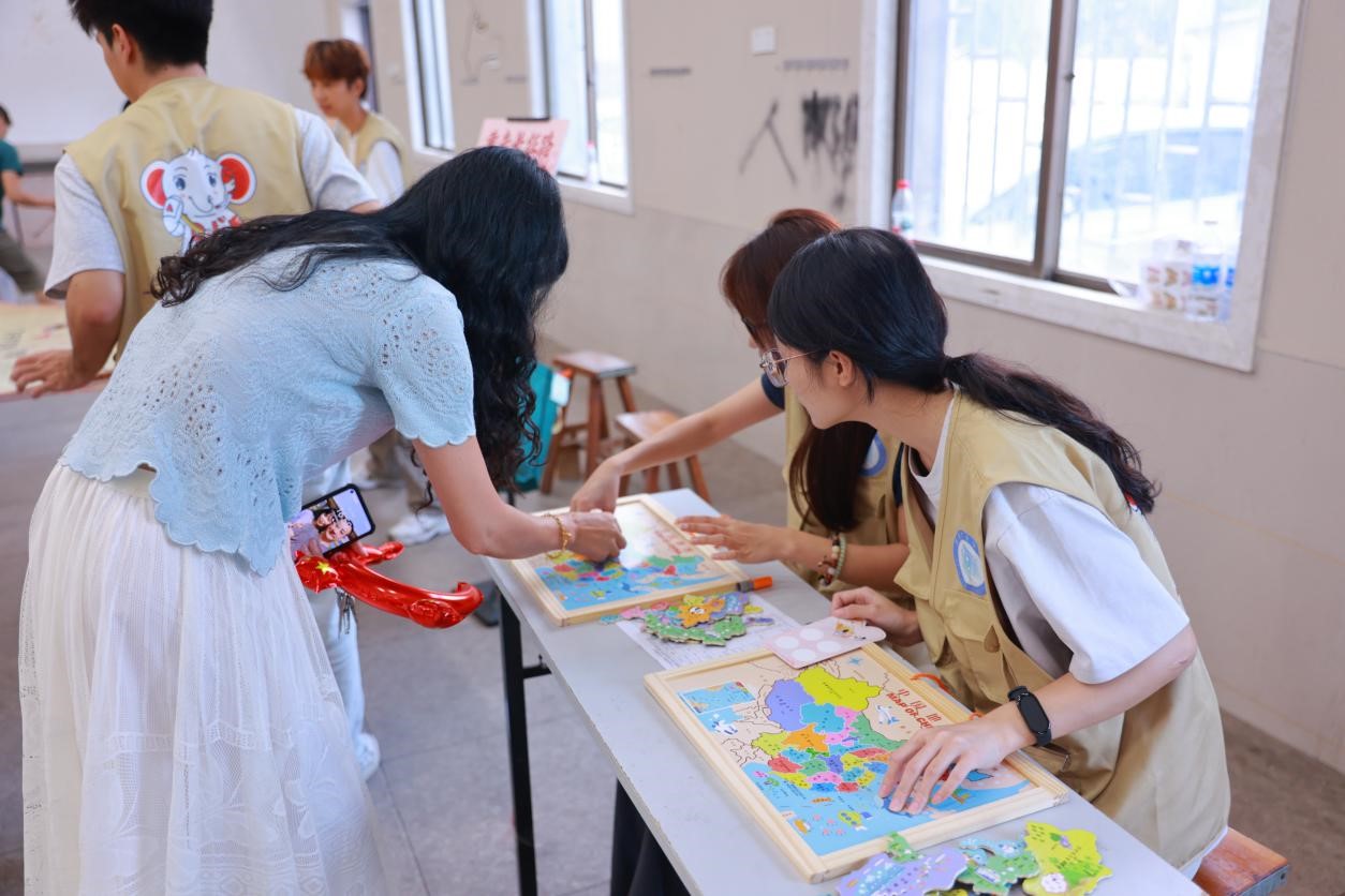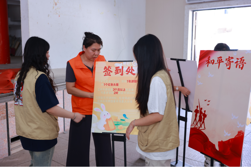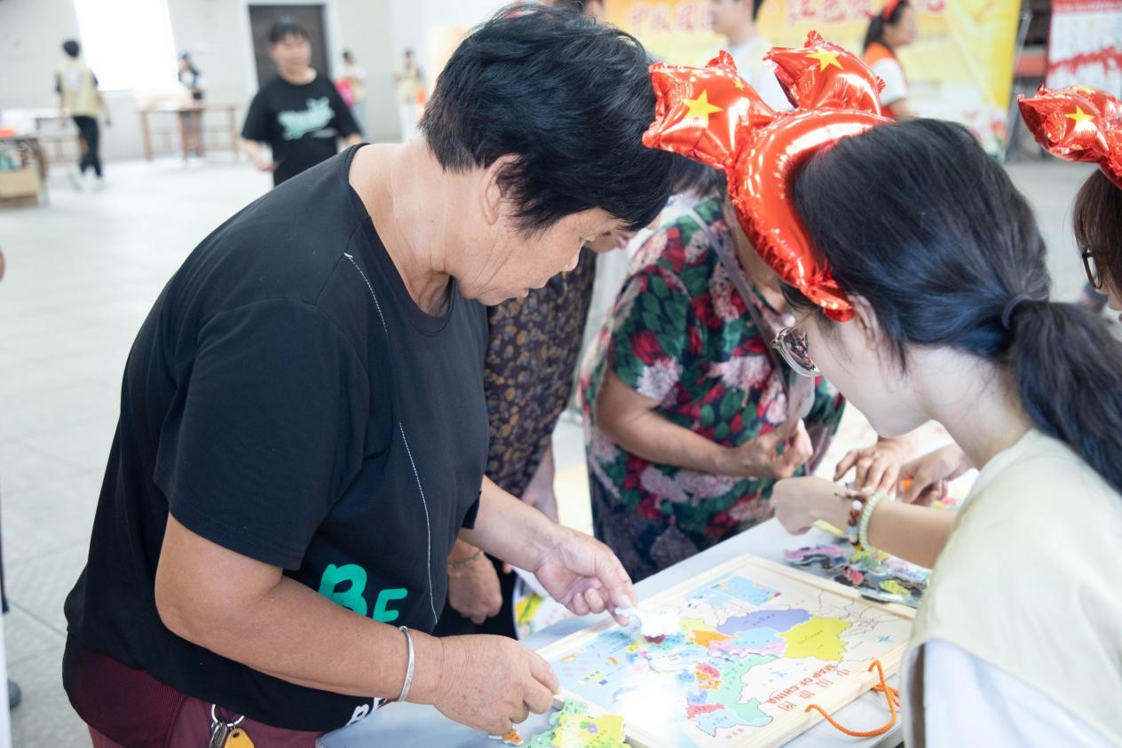 在“拼出中国地图”与爱国主义教育双区域,红色教育实践同步展开。志愿者与村民围坐桌前,专注拼接祖国版图,在指尖触摸中感受疆域辽阔;教育区内,志愿者以生动的讲述回顾历史瞬间,引导村民写下和平寄语,张贴于展示墙上。地图的完整呈现与寄语墙上的真挚祈愿,共同构筑起家国情怀与和平愿景的精神共鸣场。