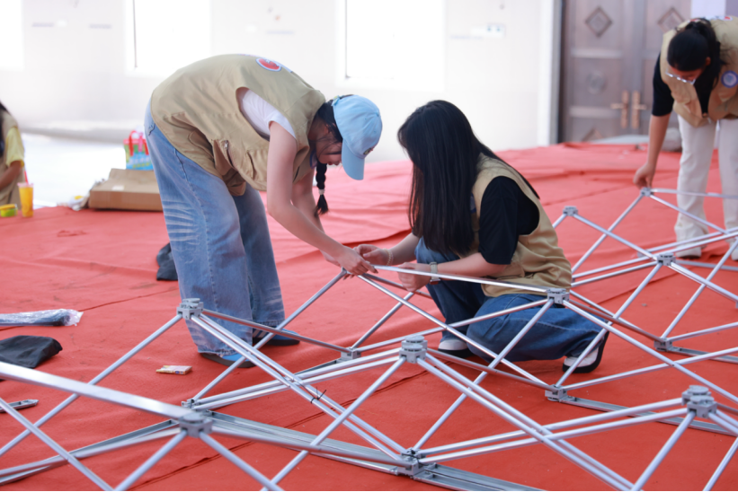 活动筹备阶段,入党积极分子们在社工的指导下化身“场地营造师”。他们协同布置展板,将活动规则以清晰的图文形式呈现;在场地中央,大家分工协作,搭建框架、组装幕布、铺设红毯……每一处细节都凝聚着志愿者的专注与匠心。从展板的毫米级校准,到设施搭建的精细打磨,志愿者们在点滴细节中铺陈出沉浸式的红色氛围基底。