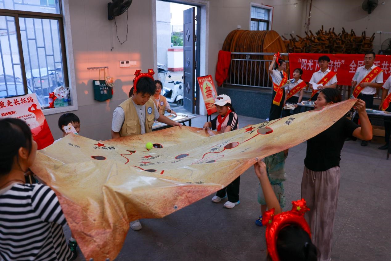活动现场设置了多个红色体验场景,寓教于乐,融情于景。投壶游戏区,志愿者手持箭矢,耐心向村民讲解规则,让传统游艺焕发新时代的精神内涵;“重走长征路”环节,大家协力操控印有长征路线的大型地图布,引导小球沿着革命足迹行进,将那段艰苦卓绝的征程,转化为可感可知的互动体验。一投一掷、一步一移之间,传统文脉与爱国情怀悄然交融。