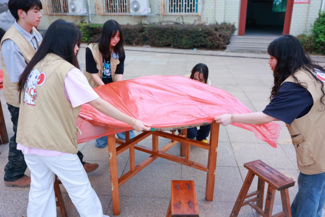 活动的顺利开展,离不开前期的周密筹备。师生团队提前到达百户村礼堂后,迅速与社工团队汇合,明确分工、密切协作。大家齐心协力对礼堂内的桌椅进行全面清洁和规整,确保场地干净整洁;为确保各功能摊位高效运转,师生们逐一检查道具、规范物料摆放,细致落实每一个筹备环节。值得一提的是,负责月饼制作板块的两名志愿者提前进行了专项学习,熟练掌握了冰皮月饼的揉制、包馅、压模等工艺流程,通过反复练习打磨技艺,力求为村民们奉上既美味又充满节日氛围的中秋美食。