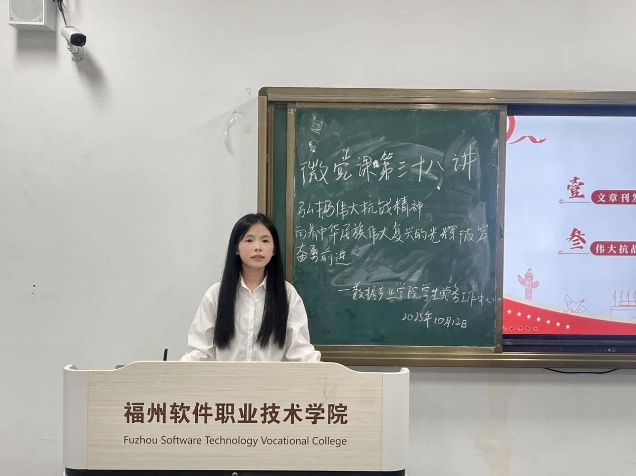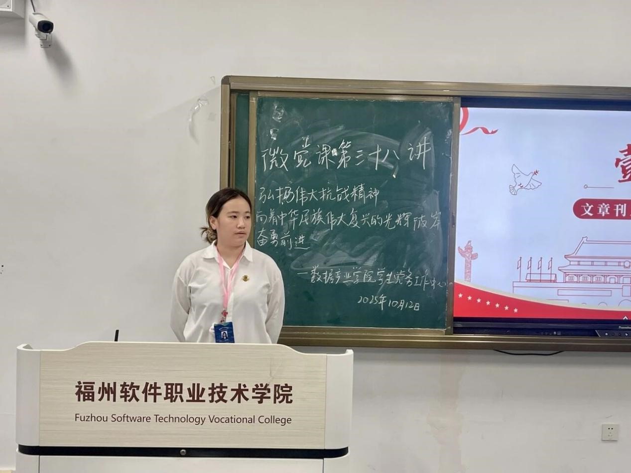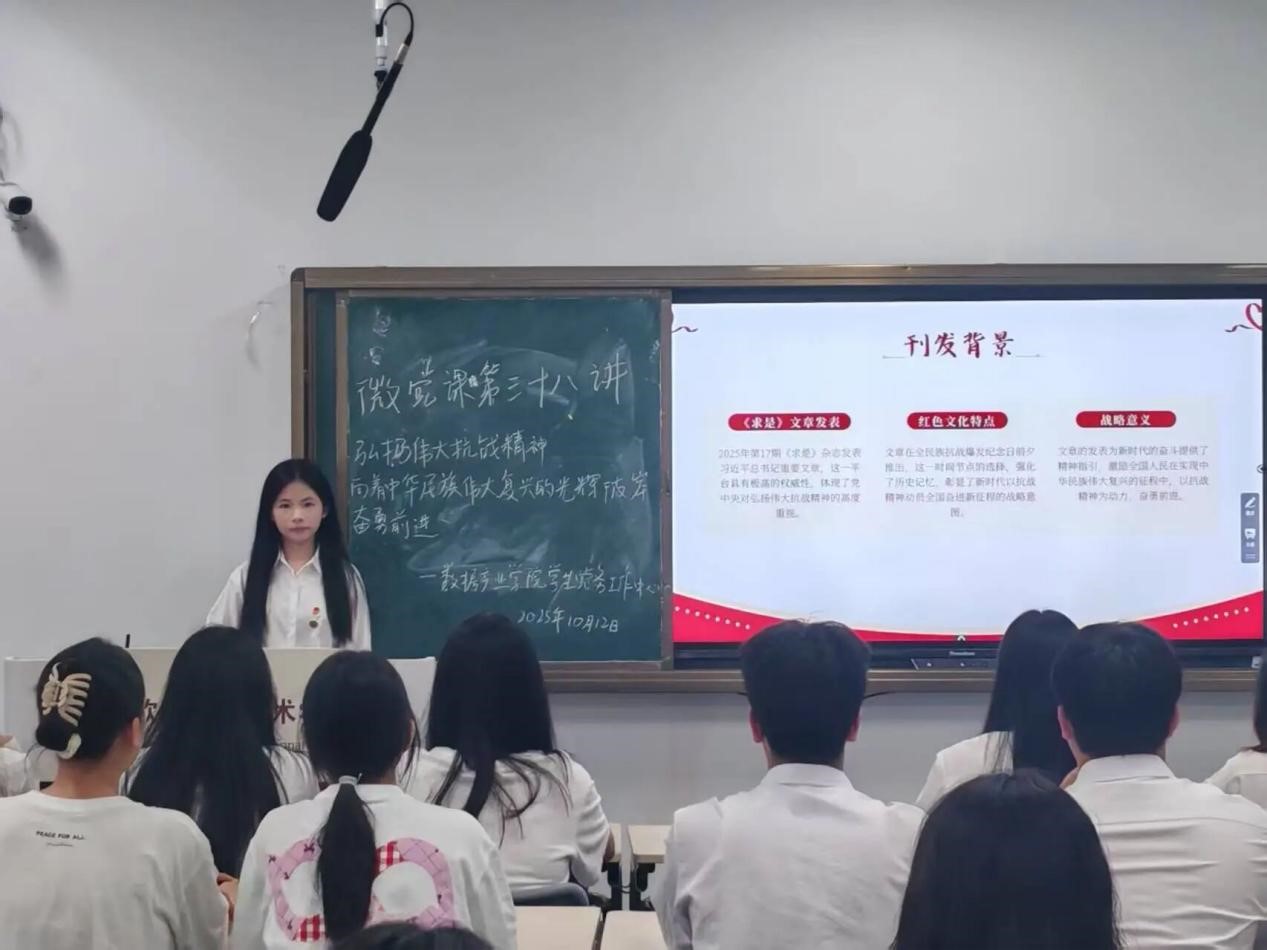 为深入学习贯彻习近平新时代中国特色社会主义思想,弘扬伟大抗战精神,激励广大青年学子在新时代征程中勇担使命、奋发有为,2025年10月12日,数据产业学院学生党务工作中心组织开展《传承红色基因,砥砺复兴征程》主题微党课。本次微党课由高可馨同学主持,郑林婧同学主讲,学院全体入党积极分子参加。