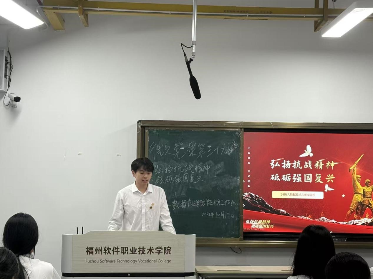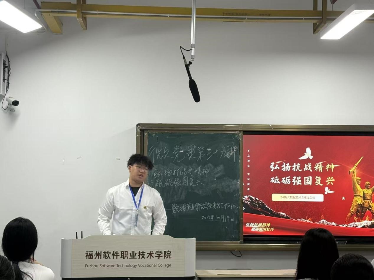 为持续深化习近平新时代中国特色社会主义思想学习成效,以伟大抗战精神凝聚青年力量,激励广大青年学子在新时代新征程中主动担当、实事求是,2025年10月19日,数据产业学院学生党务工作中心组织开展《弘扬伟大抗战精神,向着中华民族伟大复兴的光辉彼岸奋勇前进》主题微党课。本次微党课由施晟杰同学主持,沈浩松同学主讲,学院全体入党积极分子参加。