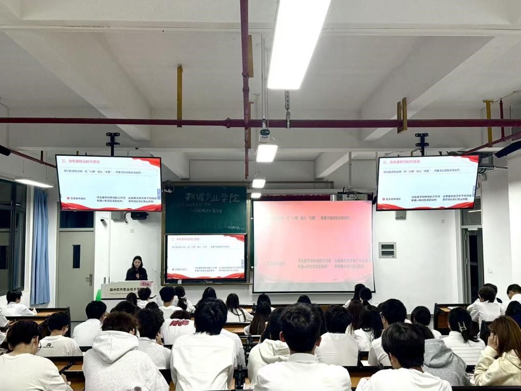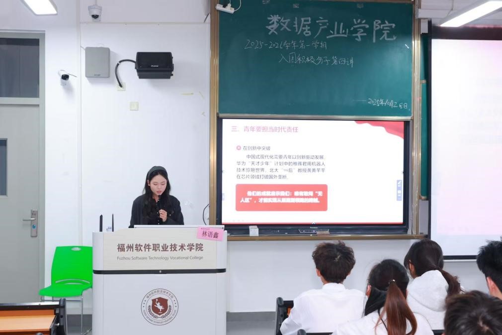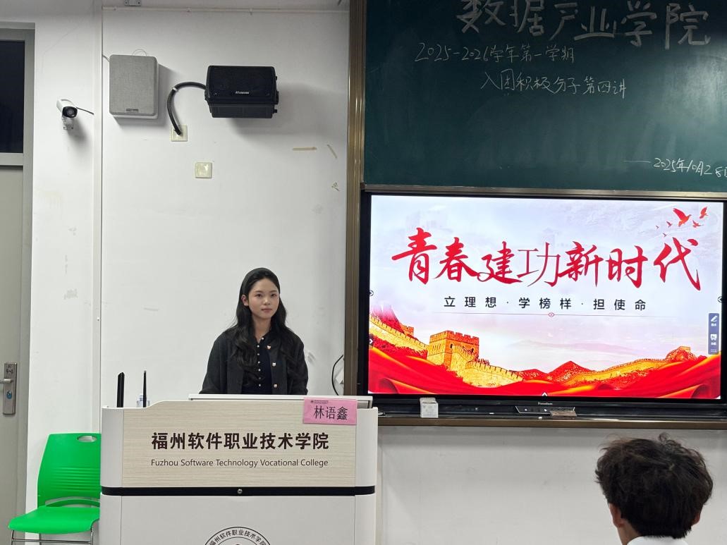 以青春之热忱,续共青团之荣光,百年团史的回响在教室中激荡,数据产业学院于10月28日在教学楼F520举行了2025-2026学年第一学期入团积极分子培训班第四讲——《青春建功新时代》。本次讲座由思政辅导员林语鑫老师担任主讲人,全体入团积极分子参与此次培训班。