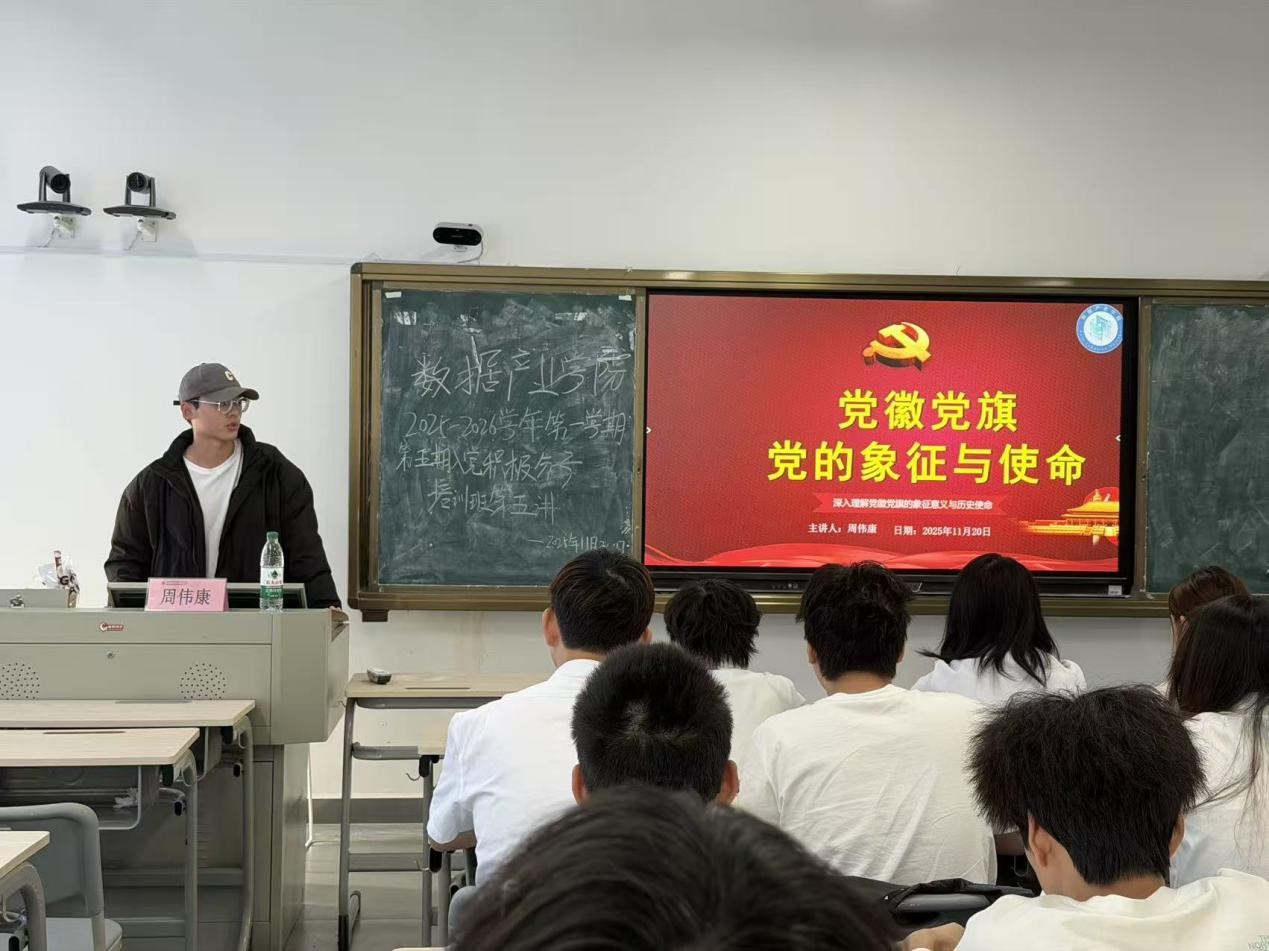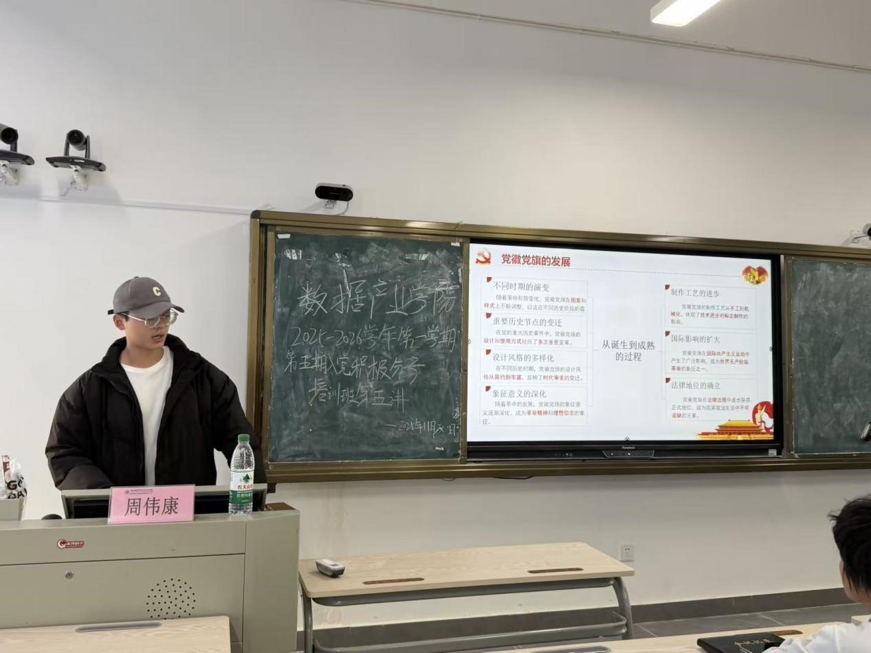 为深入贯彻落实习近平新时代中国特色社会主义思想,切实提高入党积极分子对党徽党旗的认知,筑牢信仰之基、补足精神之钙。数据产业学院于11月20日在教学楼C306开展第五期入党积极分子培训班党课第五讲。本次培训由数据产业学院思政辅导员周伟康老师授课,第五批入党积极分子培训班成员共同参与。