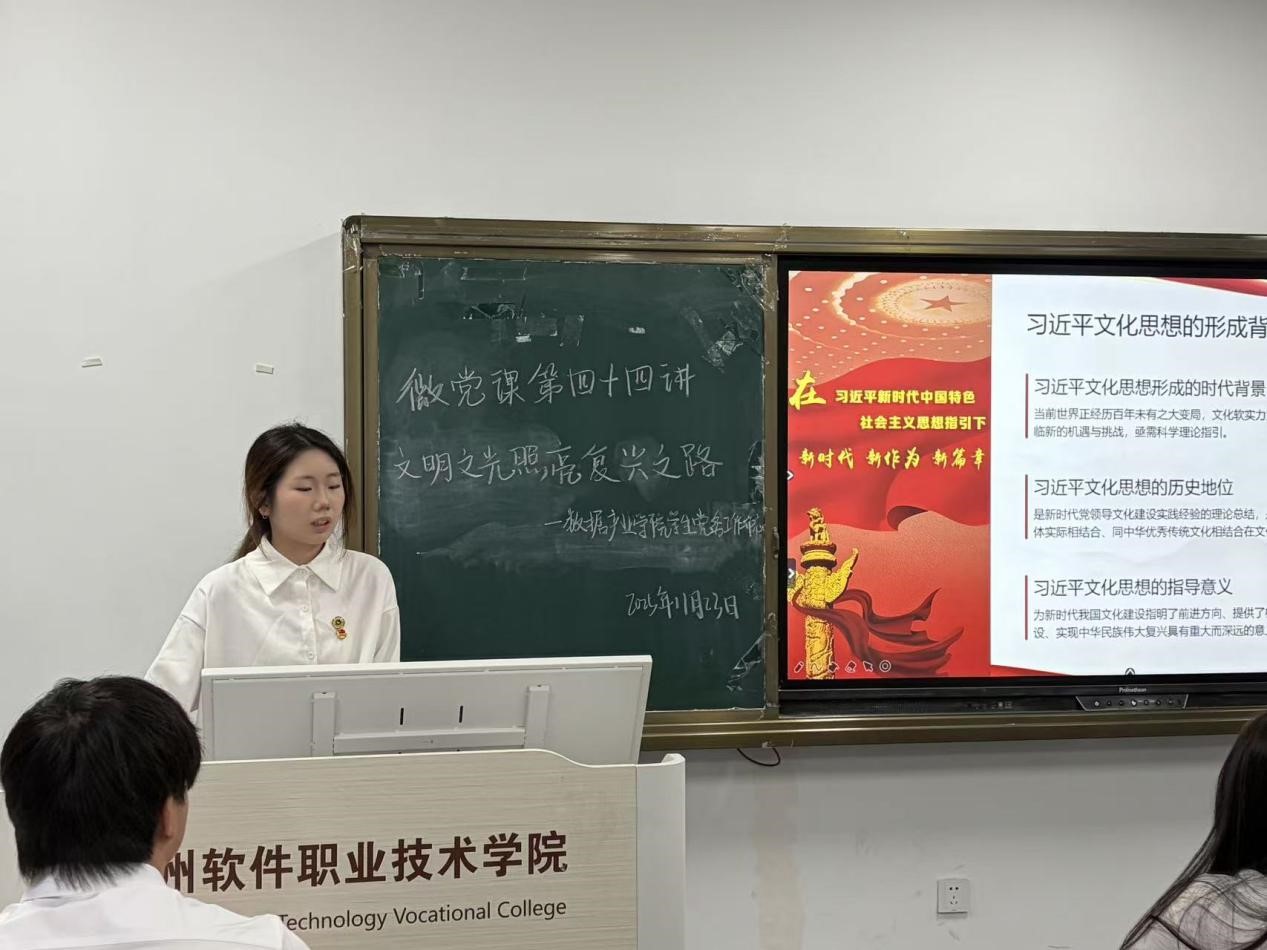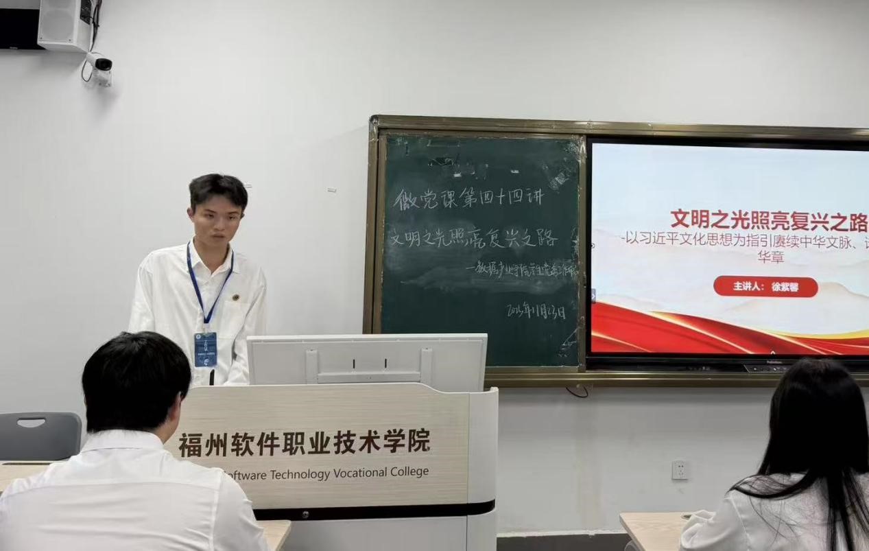 微党课伊始,徐紫馨同学强调,习近平文化思想是引领民族复兴的精神旗帜。其核心要义在于筑牢中华民族文化主体性根基,守护历史文脉根脉,推动中华优秀传统文化在当代焕发新生。沿着这一思想指引的方向,我们唯有持续增强文化自信,积极探索中华优秀传统文化的现代表达与创新路径,让文明传承与时代发展同频共振,在赓续文脉中为民族复兴贡献青春力量。